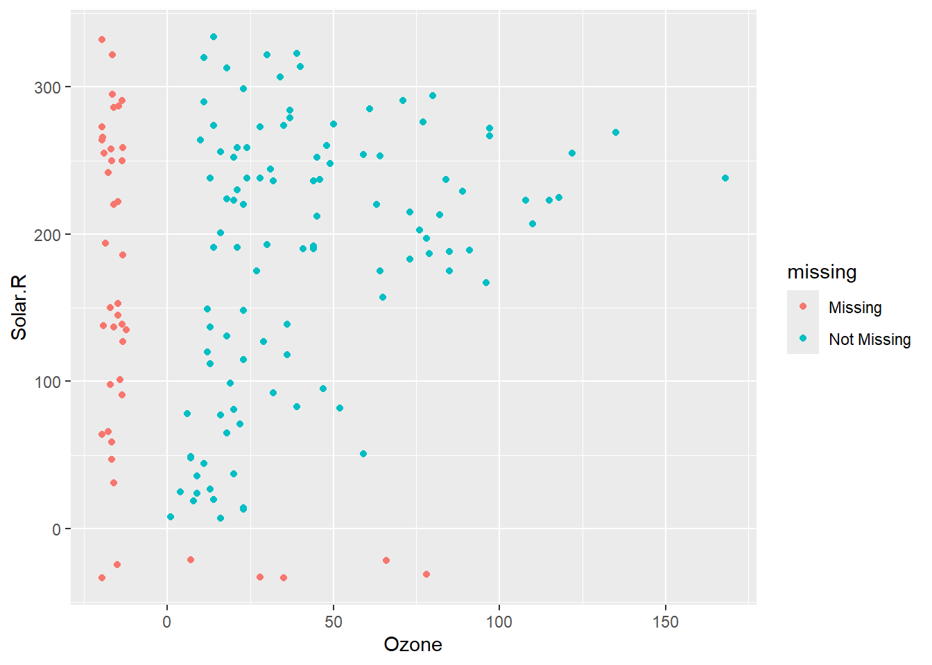 geom_miss_point allows those rows to be included in the plot. We can see the two observations missing both Ozone and Solar.R in the bottom left corner of the plot.