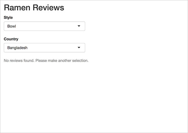 })Note that above, I’ve changed the error message in the validate() function to be blank. This is because whenever a user filters out all rows from the data, the bar chart will already display the error message. We don’t need a second error message for the map - we just need to hide it.