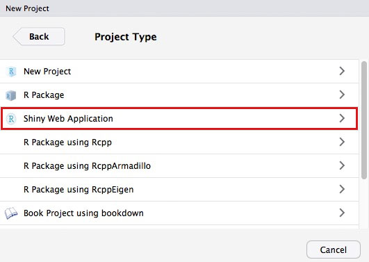 Begin by creating a new project in R Studio, but be sure to select Shiny Web Application.