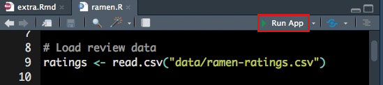 library(DT) # For making fancy tablesLet’s also load some data. Be sure to create a new “data” folder inside of your project folder and use it to store the “ramen-ratings.csv” file linked under “Important Files and Links” above. We’ll also need some spatial data for making the map. Add the following code below the library() functions but above the ui.
