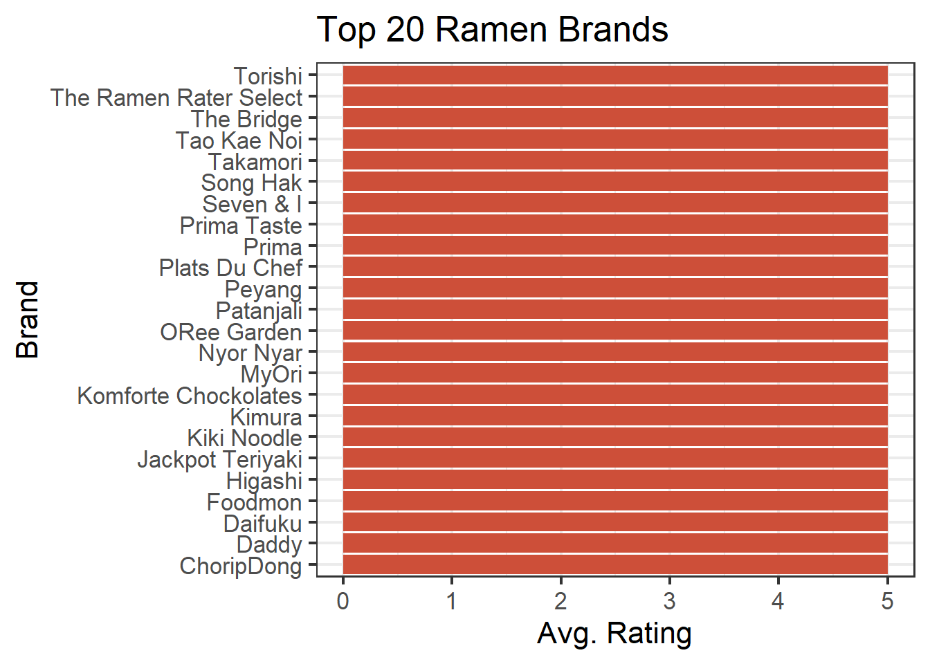 However, before we can use ggplot to create our bar chart, we’ll need to do some data transformations. Remember: we want a bar chart for only the top 20 brands of ramen. That means we’ll have to group, summarize and arrange our data first.