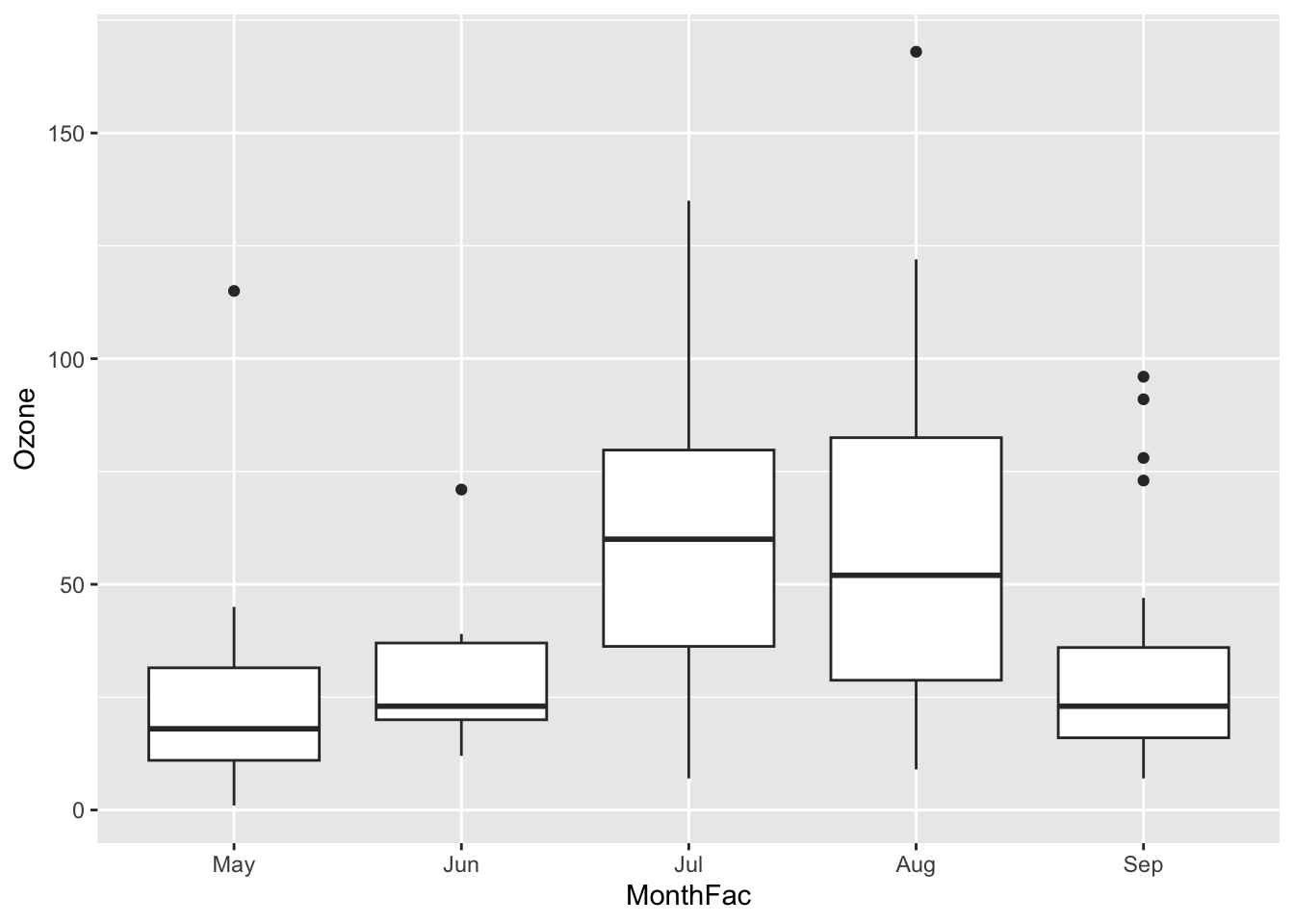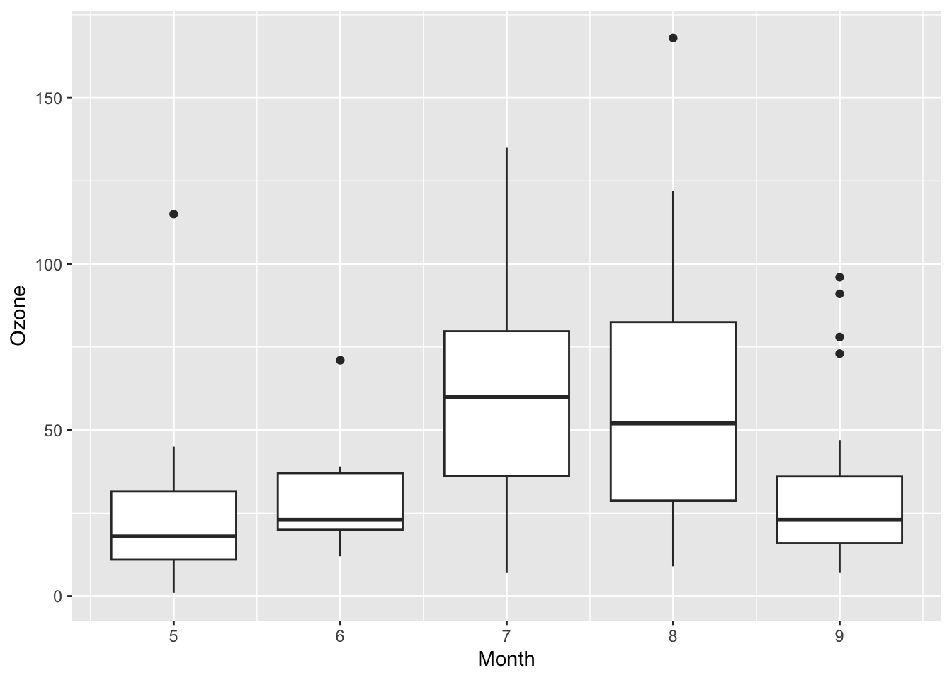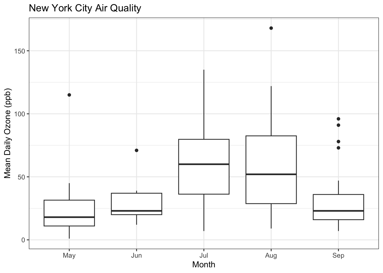 geom_boxplot() + xlab("Month") + ylab("Mean Daily Ozone (ppb)") + ggtitle("New York City Air Quality") + theme_bw()Warning: Removed 37 rows containing non-finite values (`stat_boxplot()`).