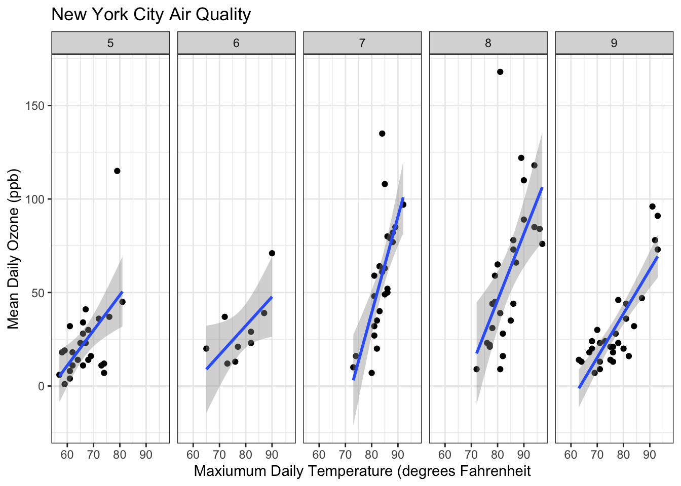 ggplot(airquality, aes(x=Temp, y=Ozone)) + geom_point() + geom_smooth(method = "lm") + facet_grid(. ~ Month) + xlab("Maxiumum Daily Temperature (degrees Fahrenheit") + ylab("Mean Daily Ozone (ppb)") + ggtitle("New York City Air Quality") + theme_bw()`geom_smooth()` using formula = 'y ~ x'