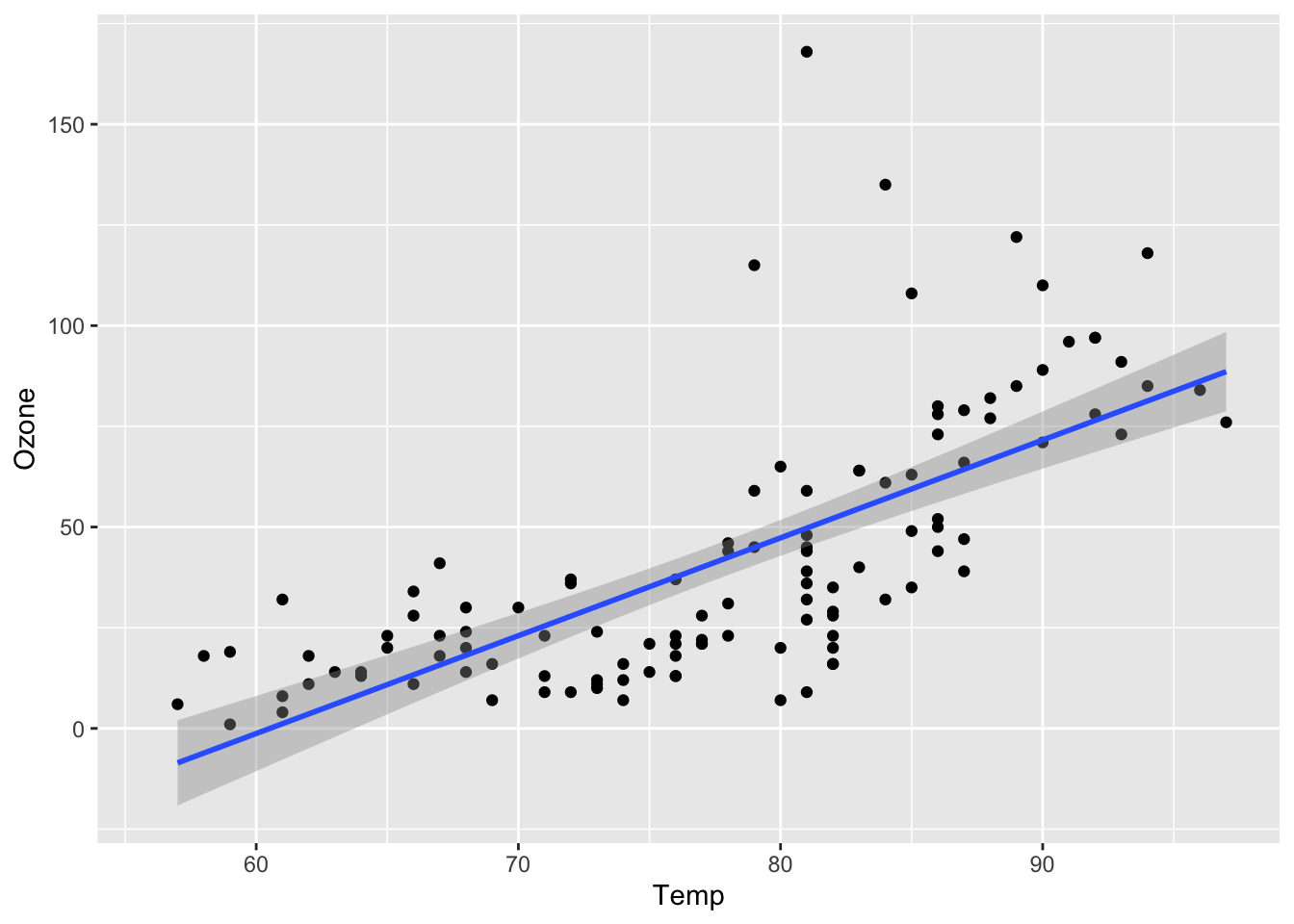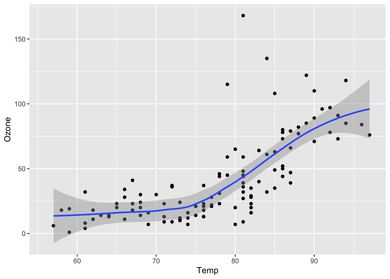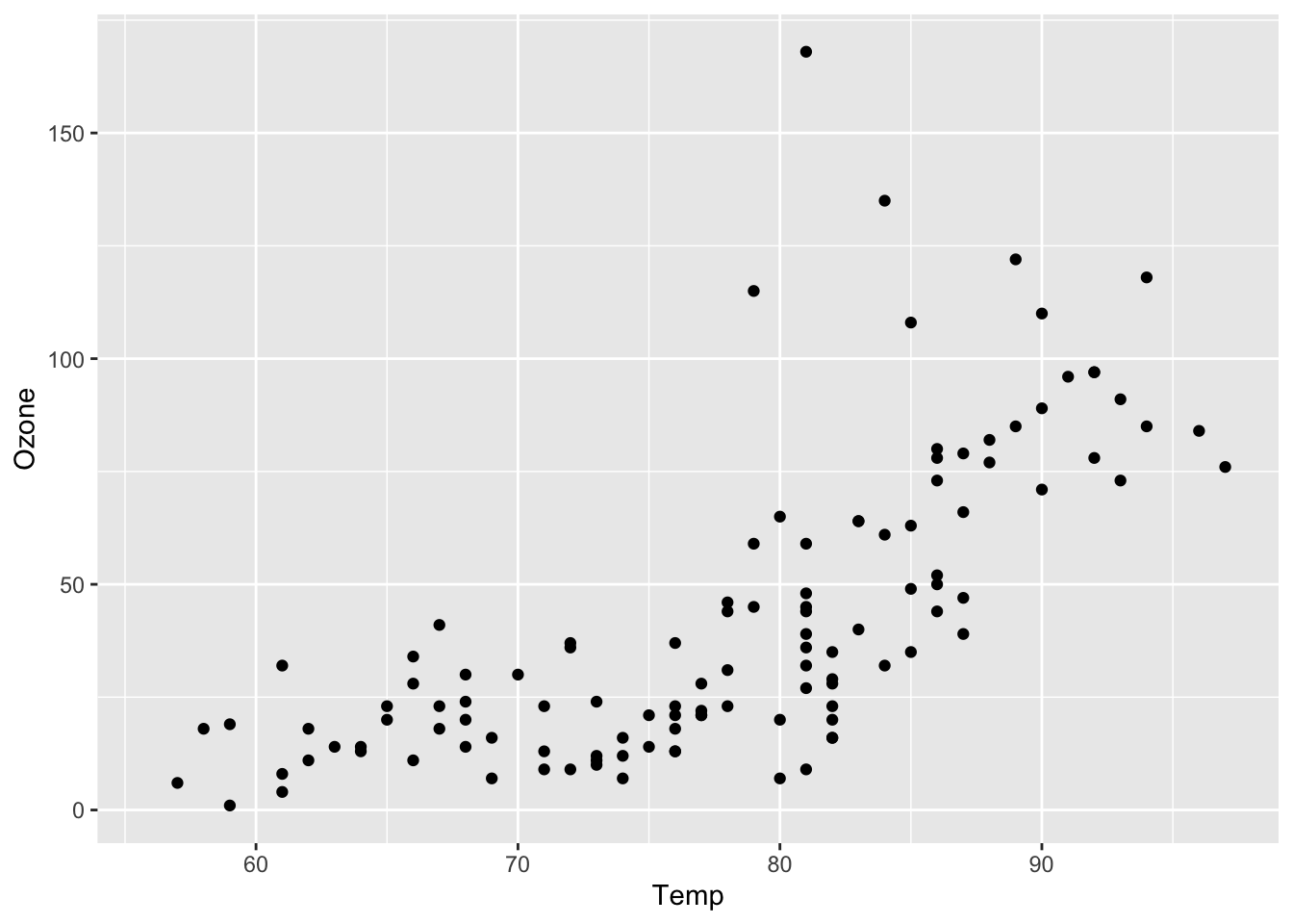 ggplot(airquality, aes(x = Temp, y = Ozone)) +