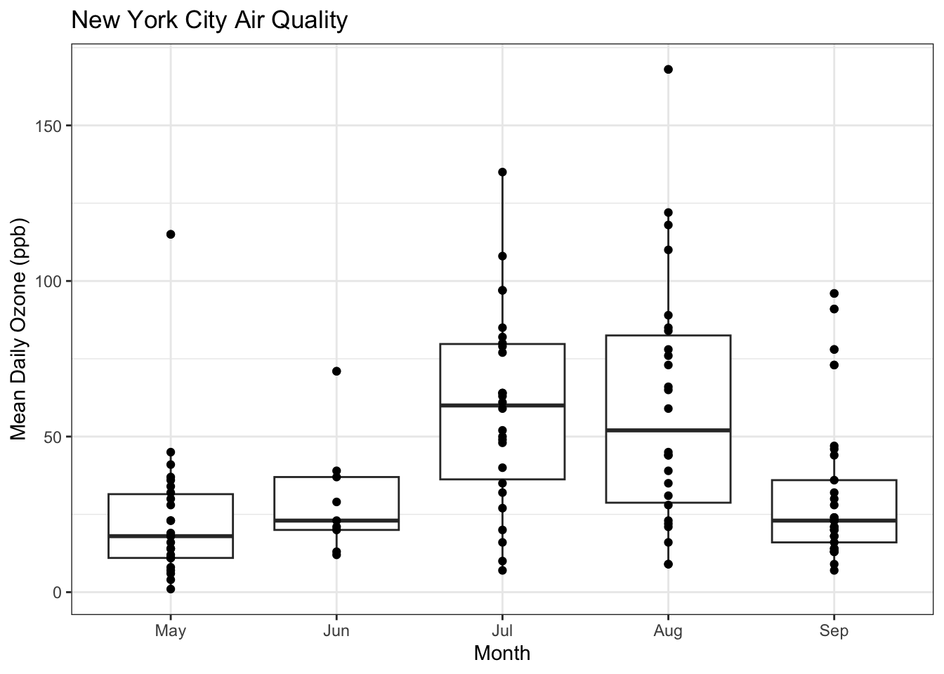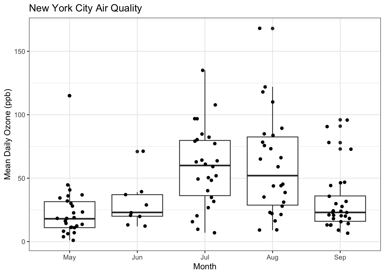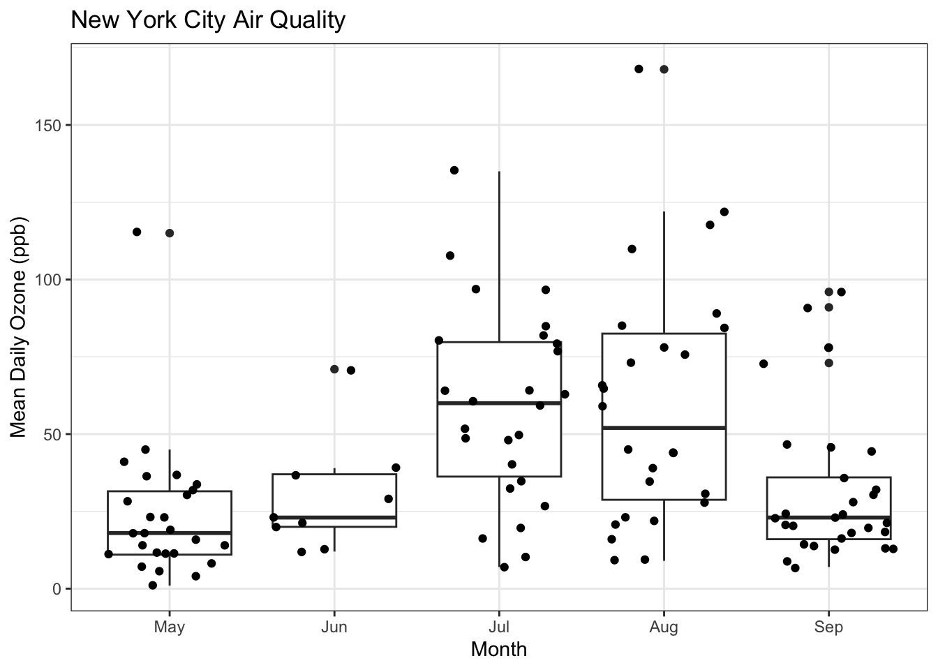 geom_boxplot() + xlab("Month") + ylab("Mean Daily Ozone (ppb)") + ggtitle("New York City Air Quality") + theme_bw() + geom_point()Warning: Removed 37 rows containing non-finite values (`stat_boxplot()`).