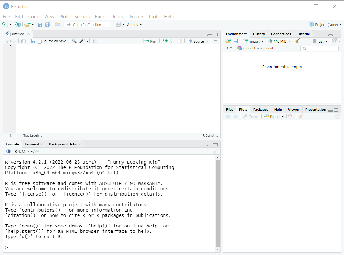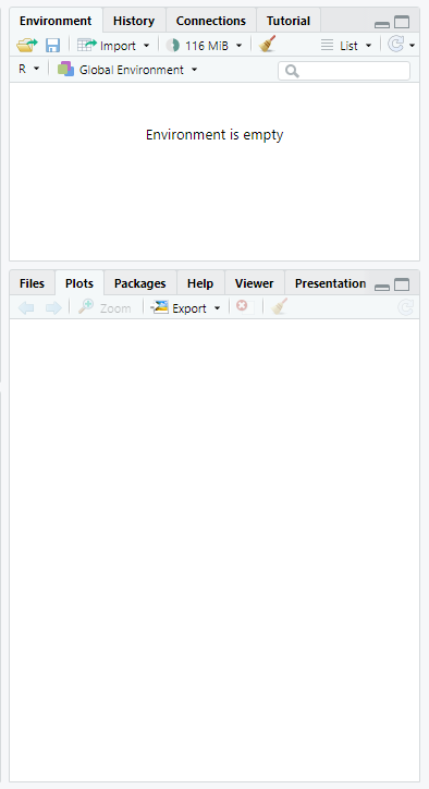Environment (top): Lists all objects and datasets defined in your current R session.