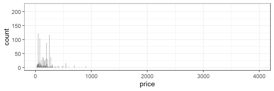 Unfortunately, with continuous variables, we usually have too many distinct values to make a table or bar chart useful.