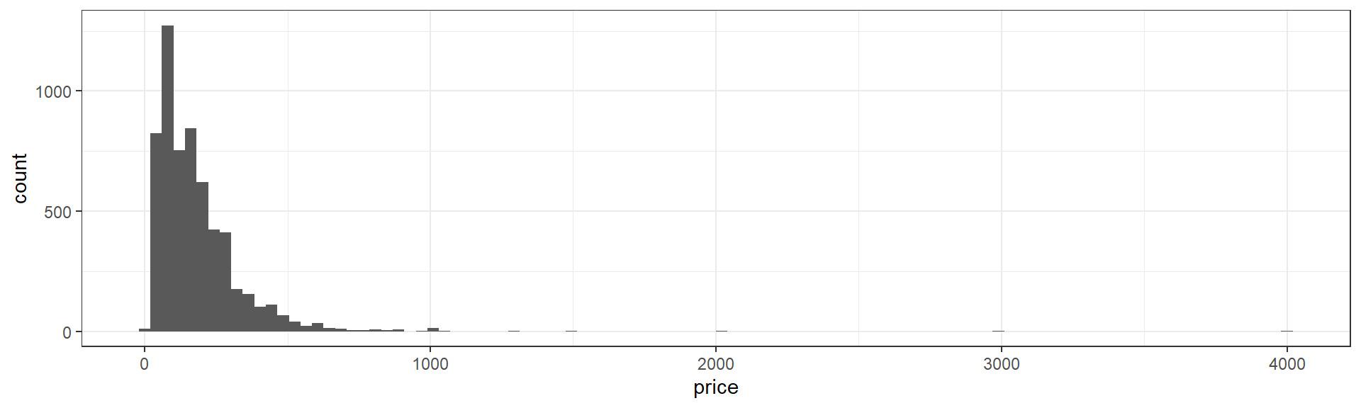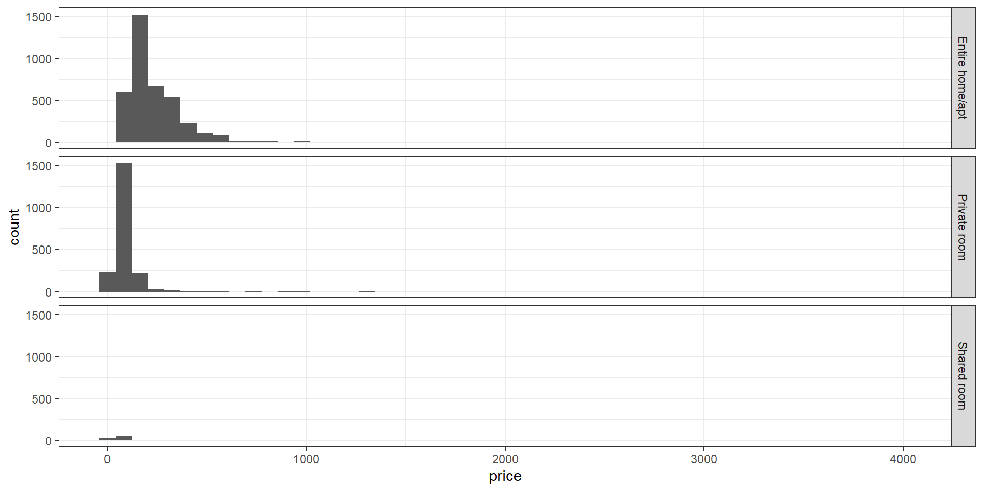 Let’s continue looking at room types, but lets compare a continous variable, prices, across the categories. Recall that we can use group_by and summarize from last week to get a summary table:
