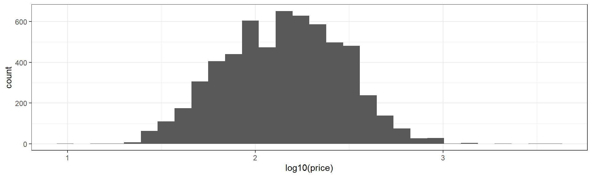 For example, it’s common to use a logarithm tranformation with skewed positive data. Let’s look at \(log_{10}(price)\) with log10.