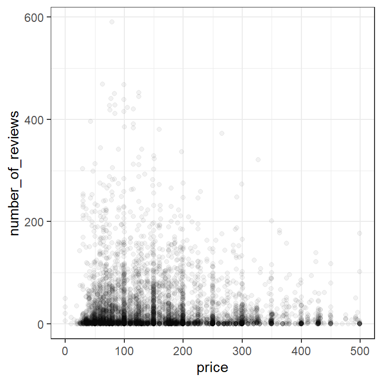 It’s clear from our alpha plot that most of the AirBnBs with price under 100 also have less than 10 reviews.