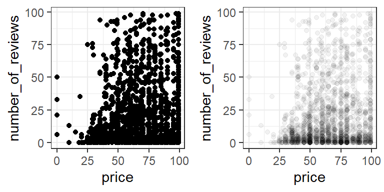 As in many large datasets, we have so many points in certain areas that it can be hard to tell how many observations are actually represented. We can get a better sense of how many observations are in a given area by adding some transparency, using the alpha aesthetic of geom_point.