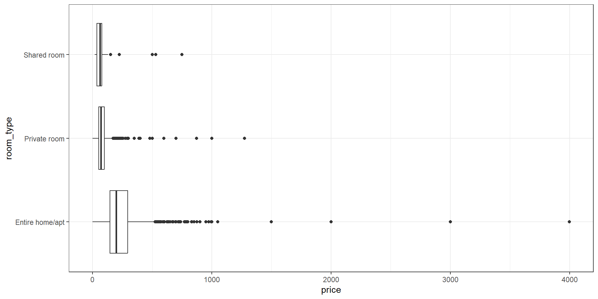 We can control the order of boxplots with reorder. reorder(room_type,price,mean) will reorder the categories of room_type based on mean price. Check the help with ?reorder for more information.